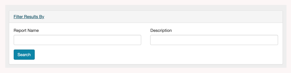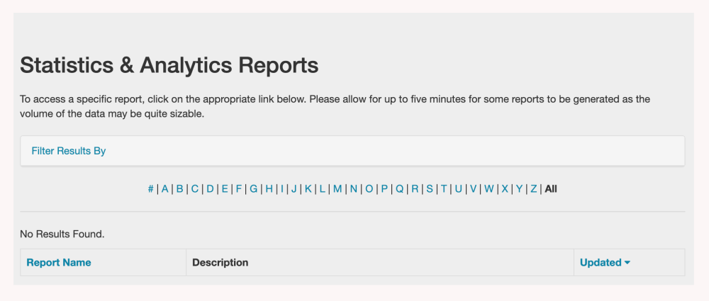 You can also filter the Statistics & Analytics Reports page to make it easier to find the report you are looking for. Clicking Filter Results By at the top of the page reveals search fields. You can enter either a Report Name or part of a Description.