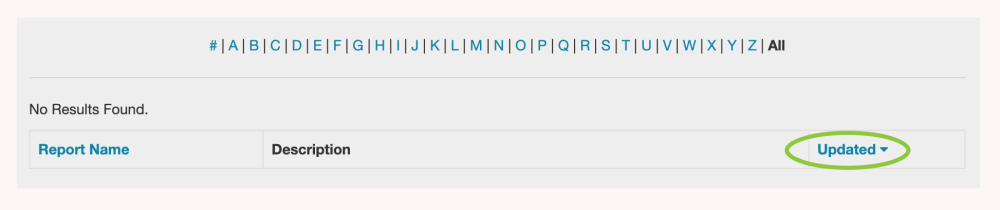 The Updated column tells you the last date that each report was updated. You can sort reports in this column in either from most recent to earliest (or in reverse) by clicking Updated and toggling the blue triangle.