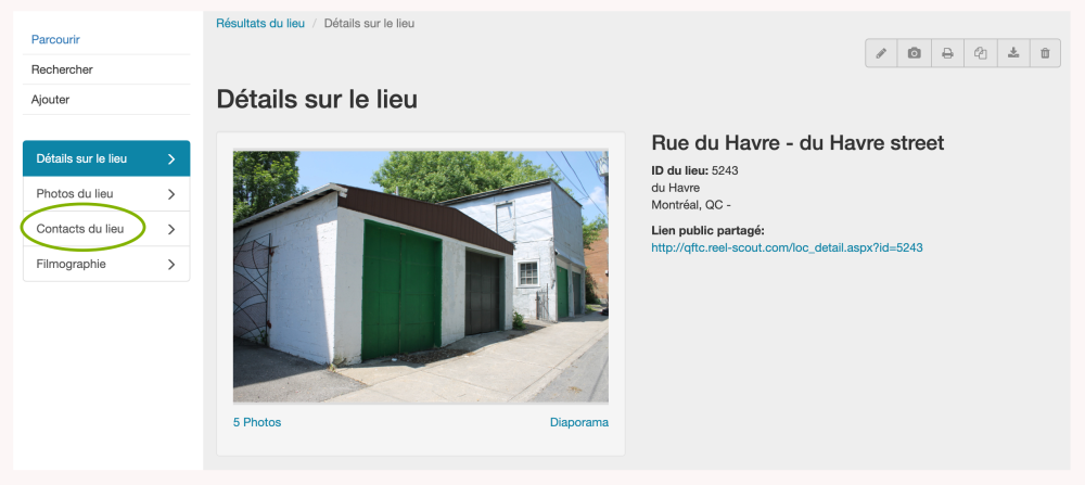 Une fois que vous avez ouvert le lieu auquel vous souhaitez ajouter des informations de contact, cliquez sur le sous-menu Contacts du lieu sur le côté gauche de votre écran.
