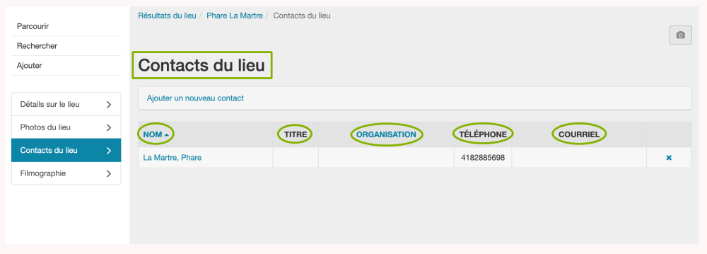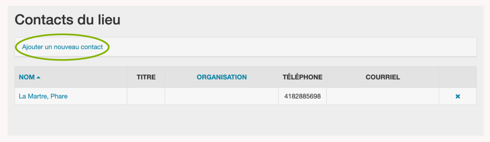 Commencez par examiner la page Contacts du lieu pour vérifier la présence de contacts existants. Ceux-ci seront listés sous les en-têtes Nom, Titre, Organisation, Téléphone et Courriel.