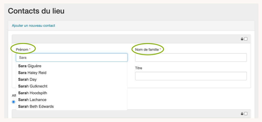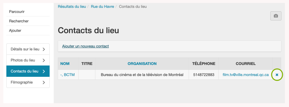 Le contact apparaît maintenant sur la page Contact du lieu sous la section Ajouter un nouveau contact. L’étoile indique qu’il s’agit d’un Contact clé. Un bouton “X” apparaît à côté du nom du contact pour permettre à l’utilisateur de supprimer la relation entre le lieu et ce contact particulier.