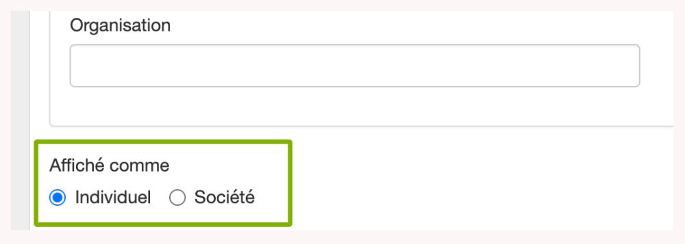 Les boutons sous les champs Organisation et Titre vous permettent de choisir si vous voulez que le contact soit listé individuellement ou rattaché à un contact de l’une entreprise.