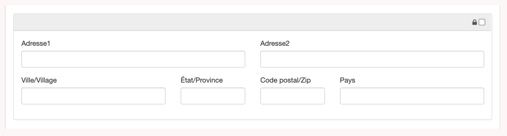 Les champs Adresse 1, Adresse 2, Ville, État/Province, Code postal/Zip et Pays sont tous des champs de forme libre. Il est possible d’indiquer des adresses nationales et internationales.