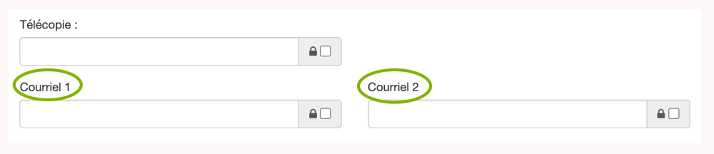 Les cases Courriel 1 et Courriel 2 sont toutes deux des champs de texte libre.