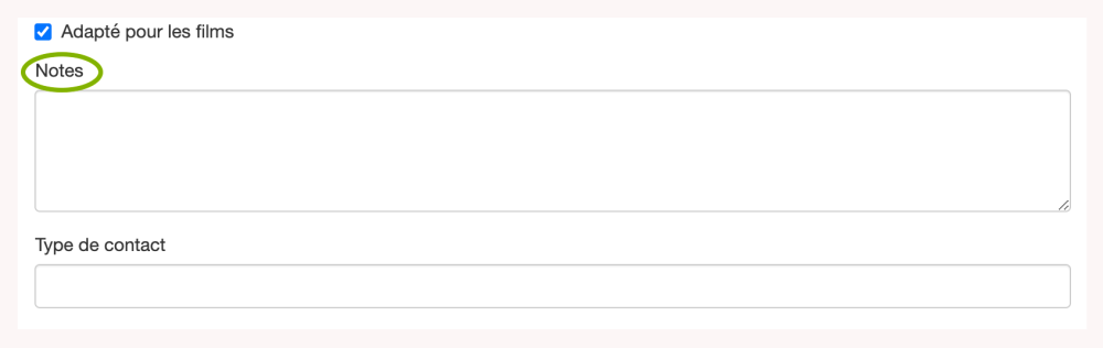 Le champ Type de contact est une liste de sélection multi-valeurs qui comprend des valeurs personnalisées pour votre bureau du film. Ces types de contact sont utilisés pour catégoriser et regrouper divers types de contacts afin de rendre les recherches plus efficaces. Il n’y a pas de limite au nombre de types de contact qui peuvent être ajoutés. Pour supprimer un type de contact, cliquez sur le “X” à côté du titre du type dans le champ Type de contact.
