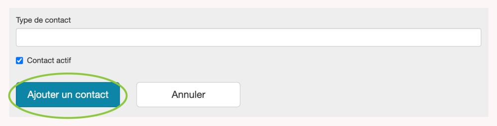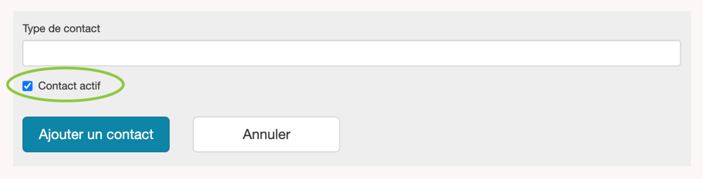 La case Contact actif est cochée par défaut. Ce champ indique si ce contact occupe toujours effectivement le rôle/le poste au sein de l’organisation désignée. Il est recommandé que tous les contacts restent dans la base de données pour un référencement historique à un moment donné.