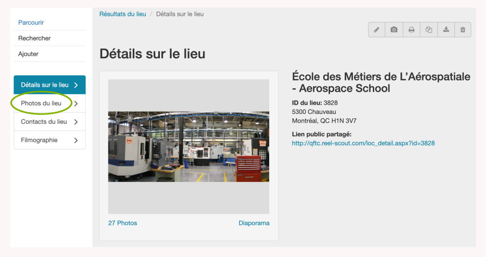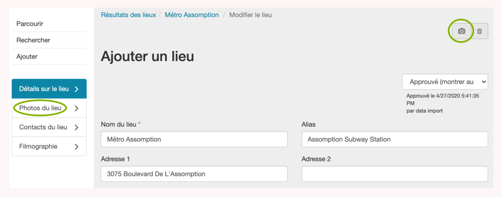 Vous pouvez également utiliser l’icône Télécharger (appareil photo) dans la barre d’outils supérieure droite pour naviguer vers la page Photos du lieu.