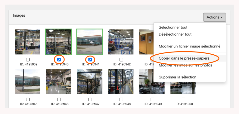 Dans le champ Images, sélectionnez les photos que vous souhaitez copier ou déplacer en cochant les cases situées sous les images. Une fois sélectionnées, les images seront mises en surbrillance par une boîte verte. Allez à l’un des boutons Actions sur le côté droit du champ Images et sélectionnez Copier dans le presse-papier dans le menu déroulant.