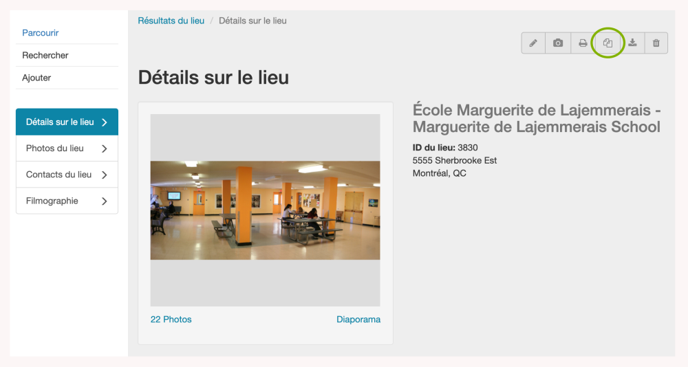 Lorsque vous arrivez à l’écran présentant ce lieu spécifique, vous remarquerez une série d’icônes en haut à droite. Cliquez sur l’icône Dupliquer.