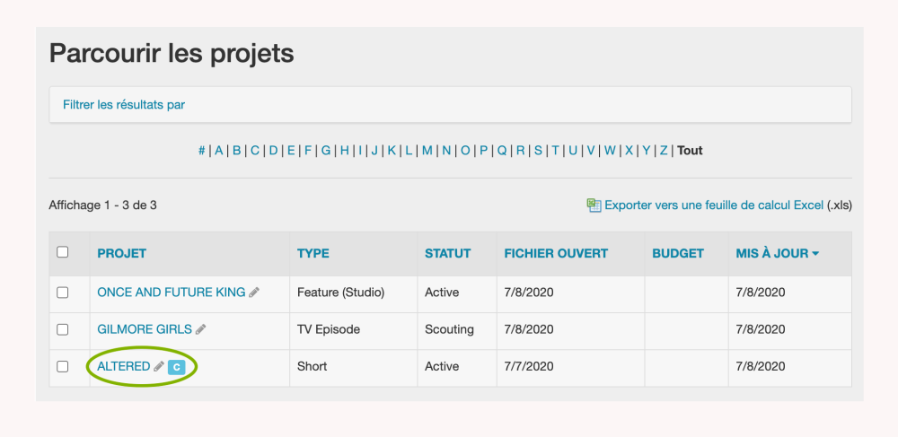 Trouvez le projet pour lequel vous souhaitez apporter des modifications. Voir Parcourir les projets et Rechercher un projet particulier.