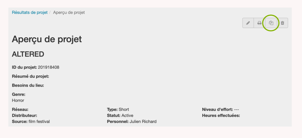 Pour copier un projet, naviguez jusqu’à la page Aperçu du projet et repérez la barre d’outils dans le coin supérieur droit. Cliquez sur l’icône Dupliquer (deux feuilles de papier). Un nouveau projet sera créé et portera le même nom que celui qui a été copié, sauf que les mots “copie de” conduiront au titre du nouveau projet. RS10 différenciera le projet dupliqué de l’original avec un numéro d’identification unique, de sorte que des modifications peuvent être apportées au duplicata en toute sécurité sans affecter l’original.