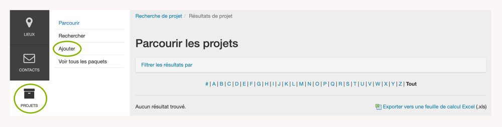 Pour ajouter un projet à Reel-Scout™ version 10, commencez par entrer dans le module Projets de la barre de menu. Cliquez sur Ajouter dans le sous-menu Projets.