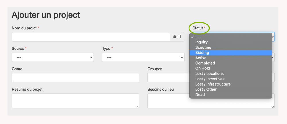 Statut est un champ obligatoire. Les statuts de projet valides sont répertoriés. Si des sélections supplémentaires sont nécessaires, informez votre administrateur système.