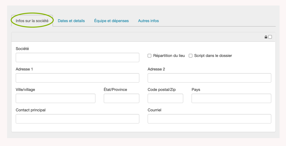 La Société de production principale est un “écran dans l’écran” interactif qui possède quatre onglets qui capturent toutes les informations dont vous aurez besoin. Il y a des onglets pour Infos sur la Société, Dates et détails, Équipe et Dépenses, et Autres infos. Lorsque l’icône du cadenas dans le coin supérieur droit du bloc Société de production principale est cochée, les informations entrées resteront confidentielles. De plus, des icônes de cadenas distinctes sont fournies pour les numéros de téléphone et de fax.