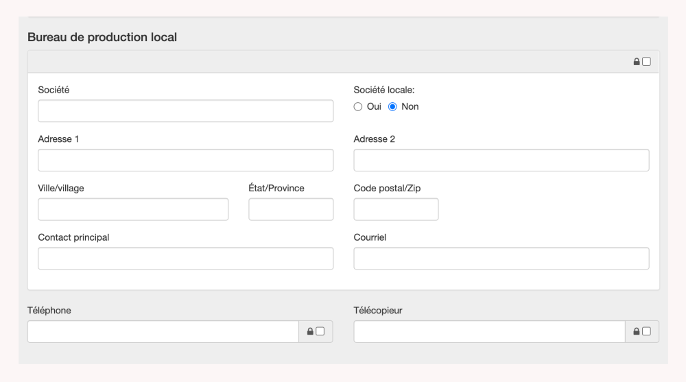 Si une société de production locale est utilisée pour le projet, ses coordonnées peuvent être saisies dans les cases de texte libre ici. Des boutons sont fournis pour indiquer si la société est basée au niveau local. Le paramètre par défaut de l’attribut Société basée au niveau local est “Non”. Lorsque l’icône du cadenas dans le coin supérieur droit du bloc Société de production locale est cochée, les informations saisies restent confidentielles. De plus, des icônes de cadenas distinctes sont fournies pour les numéros de téléphone et de fax.