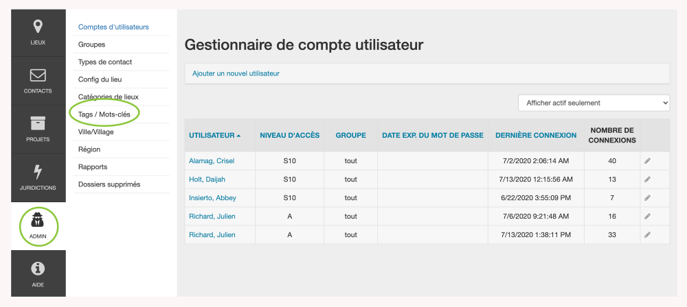 Pour accéder à la page Mots-Clés, commencez par cliquer sur Admin dans la barre de menu.