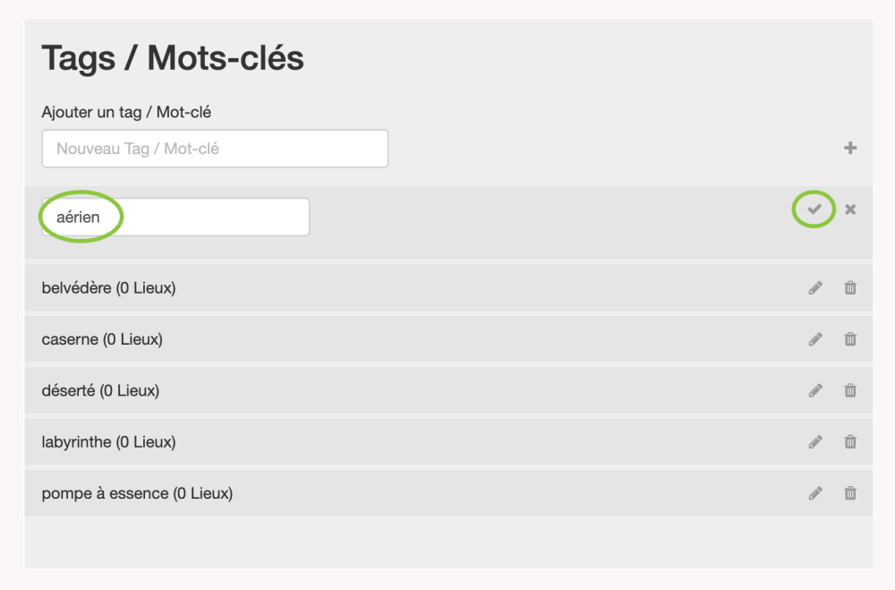 En sélectionnant l’icône du crayon, le mot-clé devient un champ modifiable. Entrez le mot ou la phrase que vous voulez changer le mot clé. Cliquez sur la coche pour enregistrer votre entrée, ou cliquez sur le “X” pour revenir à la navigation par mot-clé.