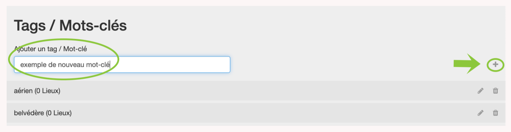 Pour ajouter de nouveaux mots-clés, saisissez le mot ou la série de mots que vous souhaitez utiliser dans le champ situé sous Ajouter un Mot-Clé. Cliquez sur le signe plus (+) sur le côté droit de l’écran pour l’ajouter à votre liste.