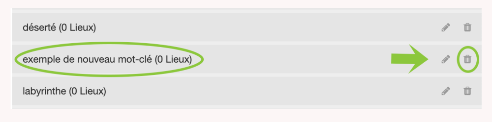 Pour supprimer un mot-clé, cliquez sur l’icône Supprimer (corbeille) sur le côté droit de l’écran. La suppression est une tâche normalement effectuée sur les mots-clés inefficaces (ceux qui n’ont pas ou très peu de lieux associés).