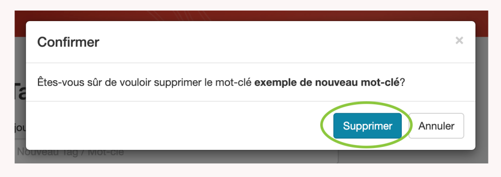 Terminez l’étape de confirmation en cliquant sur Supprimer, ou cliquez sur Annuler pour revenir à la navigation par mots-clés.