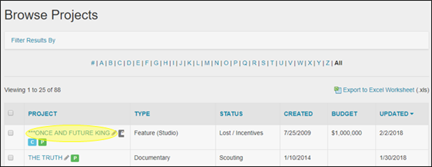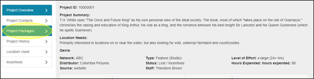 L’affichage des paquets de lieu qui ont déjà été créés est facile dans Reel-Scout™ version 10. Commencez par entrer dans le module Projet pour localiser le projet dont vous voulez visualiser les paquets. Pour plus d’informations, voir Parcourir les projets et Rechercher un projet particulier.
