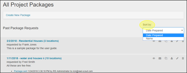 La page Tous les paquets du projet affichera les paquets qui ont été créés pour ce projet. En utilisant le menu déroulant Trier par sur le côté droit de l’écran, vous pouvez trier les paquets par ordre alphabétique de nom ou par la date de leur création.