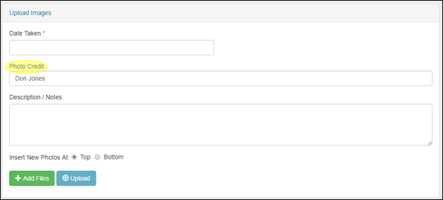 At the beginning of the upload process, you can add as many files as you wish. You can add the photographer credit to the Photo Credit field. When Upload is selected, all of the files that were added will automatically be attributed to the Photo Credit that you entered.