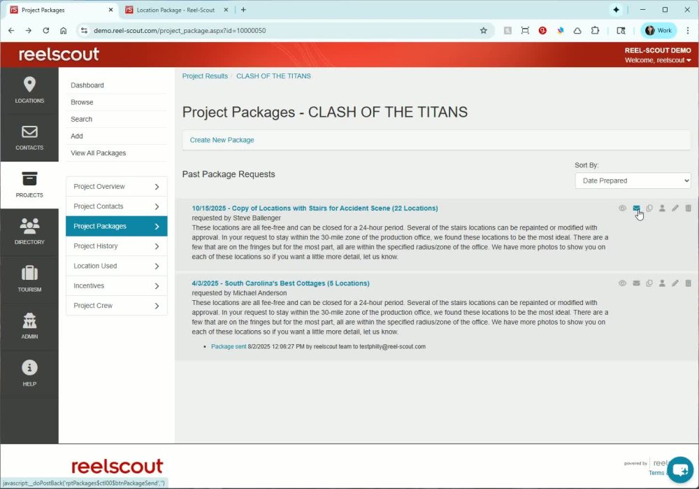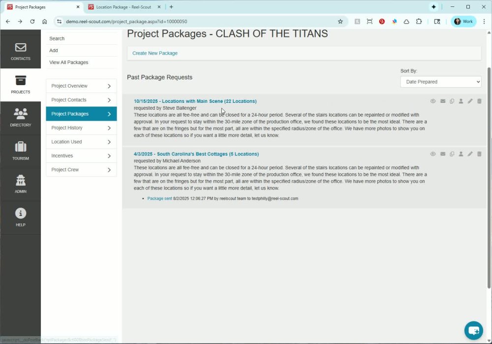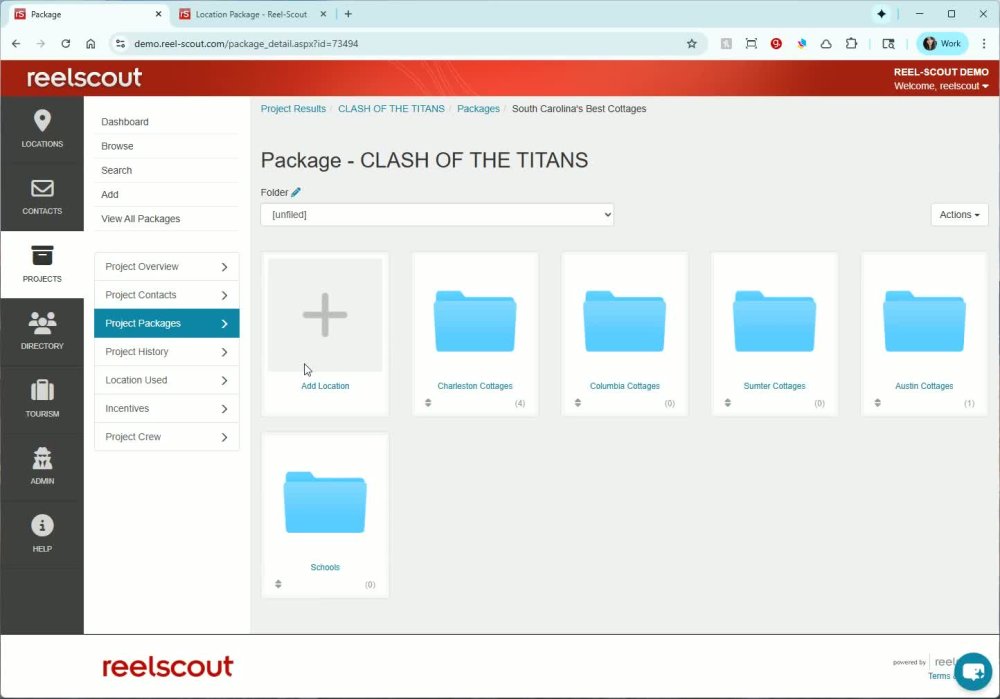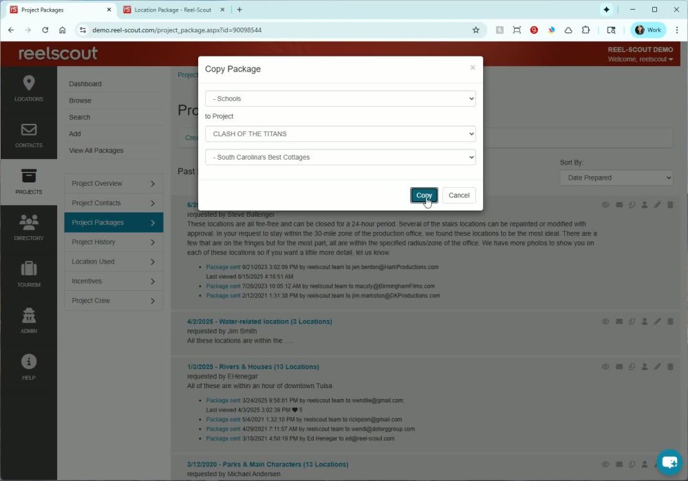 - Select the destination project (e.g., Clash of the Titans) and an existing package (e.g., South Carolina’s Best Cottages).