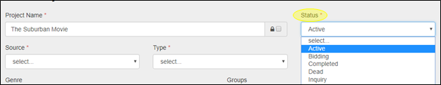 Status is a required field. Valid project statuses are listed. If additional selections are needed, inform your system administrator.