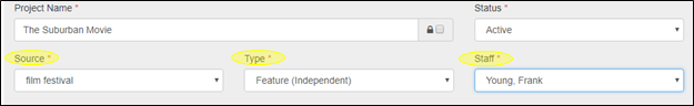 The Source, Type, and Staff fields are required inputs for a project to be saved in RS10. These are single-select, drop-down menus that allow you to record the source of the project, the type of project, and the film office staff member that is responsible.