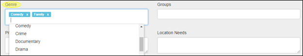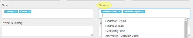 The Group box is a drop-down menu configured explicitly for your film office. The Groups field allows you to assign as many groups as you wish. As an alternative to scrolling to find a particular group, you can begin typing the name of the group and RS10 will type-match your entries and display options that match your inputs. If a group needs to be removed from the field, click the “X” next to the group name.