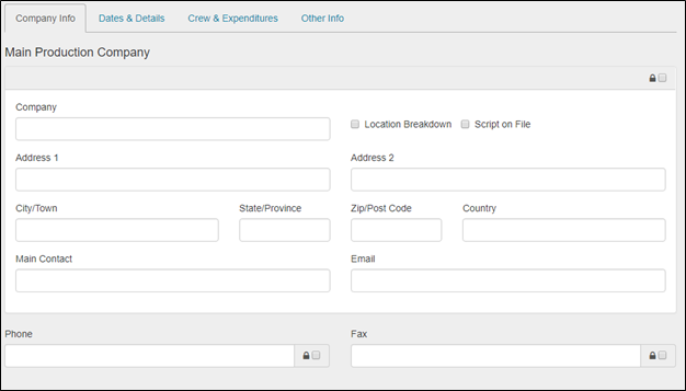 The Main Production Company is an interactive “screen within a screen” that has four tabs that capture all of the information you will need. There are tabs for Company Info, Dates and Details, Crew & Expenditures, and Other Info. When the lock icon in the upper right-hand corner of the Main Production Company block is checked, the information entered will be kept confidential. Additionally, separate lock icons are provided for the phone and fax numbers.