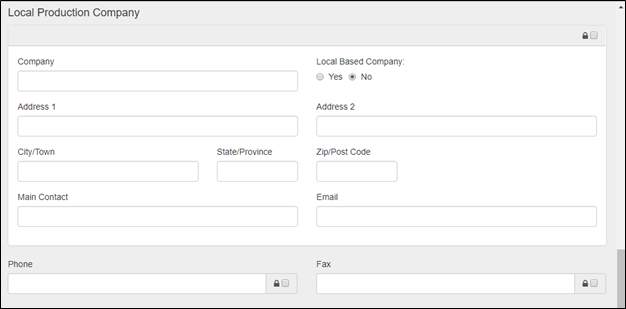 If a local production company is used on the project, their contact information can be entered in the free-text boxes here. Buttons are provided to indicate if the company is locally based. The default setting for the Locally Based Company attribute is “No.” When the lock icon in the upper right-hand corner of the Local Production Company block is checked, the information entered will be kept confidential. Additionally, separate lock icons are provided for the phone and fax numbers.
