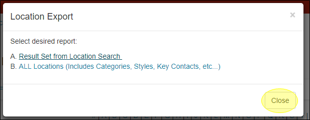 A dialog box will appear that will allow you to either export the results of your search or the entire location list. Click on your desired selection to begin the download.