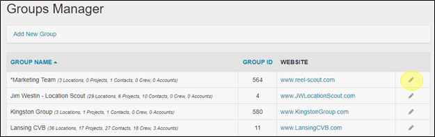 To edit a group, click the Edit (pencil) icon in that group’s line on the far right-hand side of the screen.