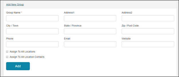 When Add New Group is selected, a drop-down menu of fields will appear. The only required field is Group Name. Once you have filled in the fields, you can choose to assign the group to all of your locations or location contacts using the checkboxes provided. You can always assign individual locations, contacts, projects, crew, and accounts as required using those modules.