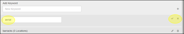 Selecting the pencil icon will make the keyword a changeable field. Enter the word or phrase that you want to change the keyword to. Click the checkmark to save your entry, or click the “X” to return to browsing keywords.