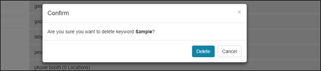 Complete the confirming step by clicking Delete, or click Cancel to return to browsing keywords.