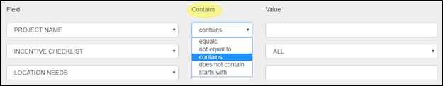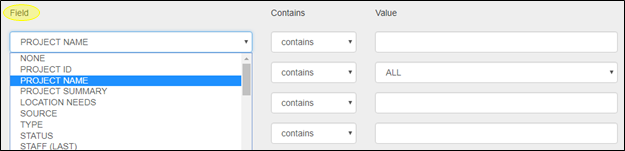 The Field selection allows you to choose from a drop-down menu of options that apply to the project search that you are conducting. If you know the type of filter that you want to use, typing the first letter of the filter will take you to that part of the drop-down menu.