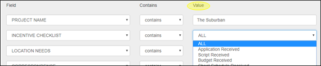 The contents of the Value field depend on the field that has been selected. Some fields allow free text-inputs into the Value block. Other fields require a limited selection of values that are configured for your film office.