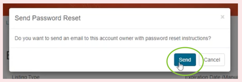 A pop-up will appear to confirm that you wish to send a password reset email, click Send.