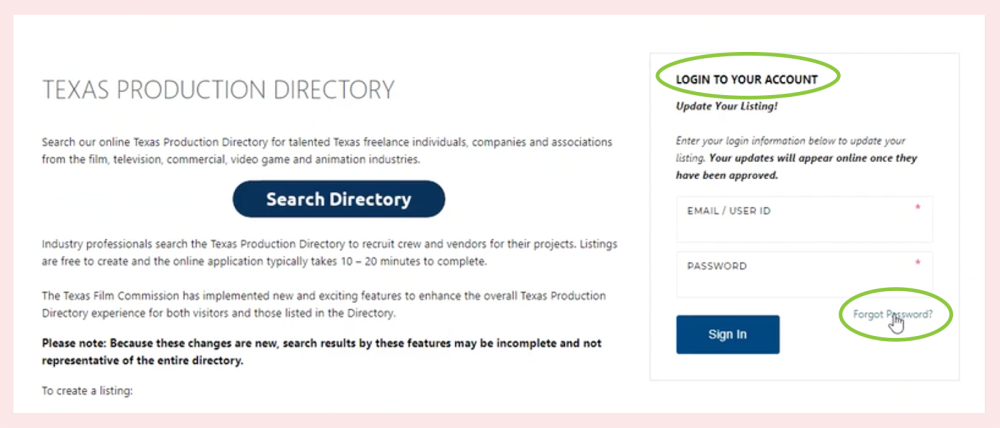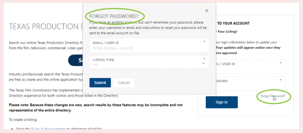 A pop-up box will appear in which they can enter in either their email address or user ID, and then select the Listing Type that they’re listed under (Crew, Support Services, Talent, etc.). They will then receive the same email mentioned above to help them reset their password directly.
