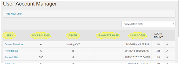To help you locate the user that you want to view or edit, RS10 features intuitive sorting tools to help you organize the listings on the User Account Manager page. Clicking on any of the column headers allows you to sort the entries into alphabetical or chronological order. When a column header is clicked, a blue triangle appears beside it. Clicking the blue triangle will allow you to toggle your listing between forward and reverse order.