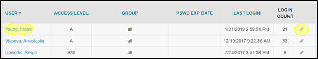 Clicking on a user’s name or the pencil icon reveals an Edit User dialog box that allows you to view and edit the following pieces of user information.