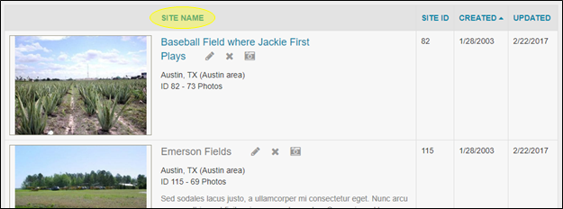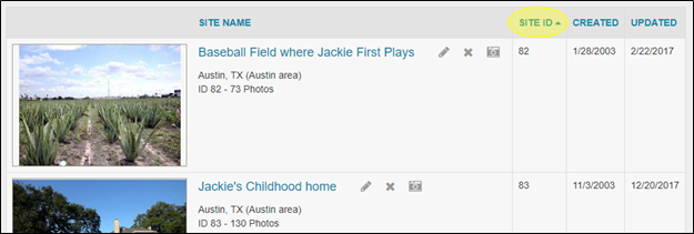 L’ID du Site est un identifiant numérique unique pour chaque site de production dans votre base de données Tourisme. En cliquant sur l’en-tête de la colonne ID du Site, vous pouvez trier vos sites par ordre d’ID du Site, de la valeur numérique la plus basse à la plus élevée. Cliquer sur le triangle bleu à côté de ID du Site vous permet de basculer entre des valeurs numériques en ordre croissant et en ordre décroissant.