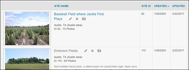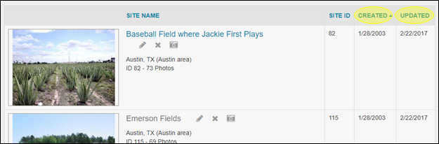 Les colonnes Créé et Mis à Jour sont les dates de création des sites dans le système RS10 ou la date de la dernière mise à jour des sites. Vous pouvez trier votre liste des sites de production dans l’ordre de la date à laquelle il ont été Créés ou Mis à Jour en cliquant sur l’un ou l’autre de ces en-têtes de colonne. Le triangle bleu à côté de l’en-tête vous permet de basculer entre les dates dans l’ordre chronologique et dans l’ordre inverse (du plus récent au plus ancien).