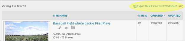 La production de rapports ou l’envoi d’informations à un client du monde des affaires nécessite parfois l’exportation d’informations sur les sites de la production en dehors de la plate-forme RS10. Pour exporter votre liste des sites de la production, cliquez sur le lien Exporter les Résultats Vers une Feuille de Calcul Excel (.xls) dans la partie supérieure droite de la page Sites de la production.