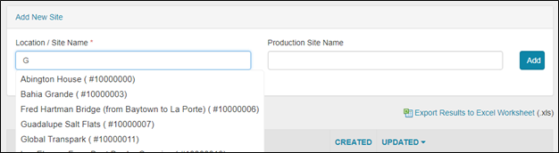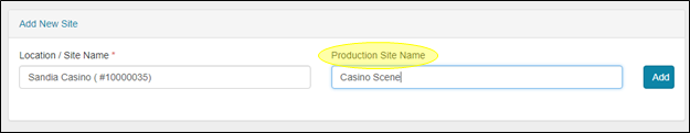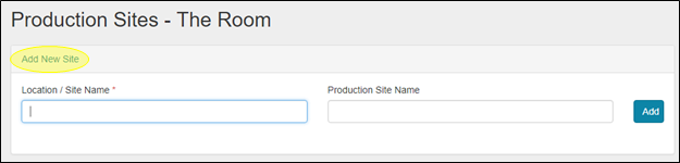 Si nécessaire, cliquez sur Ajouter un Nouveau Site en haut de la page Sites de Production. Cliquer sur Ajouter de Nouveaux Sites ouvrira des champs qui vous permettront d’ajouter le Nom du Lieu/Site et le Nom du Site de la Production. Le seul champ obligatoire, comme indiqué par les astérisques rouges, est Nom du Lieu/Site.