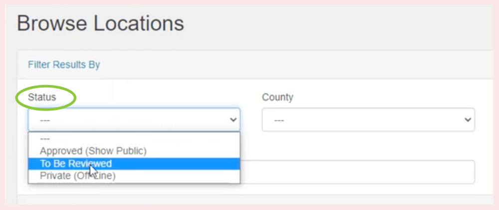 To approve Locations in batch, click on the Locations tab on the left. Under the sub-tab Browse, click on Status and choose the correct option for your search: Approved, To Be Reviewed, or Private. In the example below, we choose “To Be Reviewed” for the search.