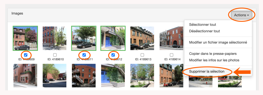 Une fois la ou les photos sélectionnées, cliquez sur le bouton Actions à droite et choisissez Supprimer la Sélection Il y a des boutons Actions en haut et en bas du champ Images sur le côté droit pour plus de commodité. Les boutons Action fonctionnent tous les deux de la même façon.